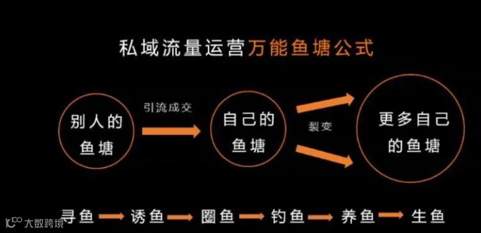 如果说公域是大海,那私域就可以算是一个池塘,我们通过各种方式把客户养在池塘里,想办法让鱼变多(就是搞流量),让鱼变大(指成交用户和复购)