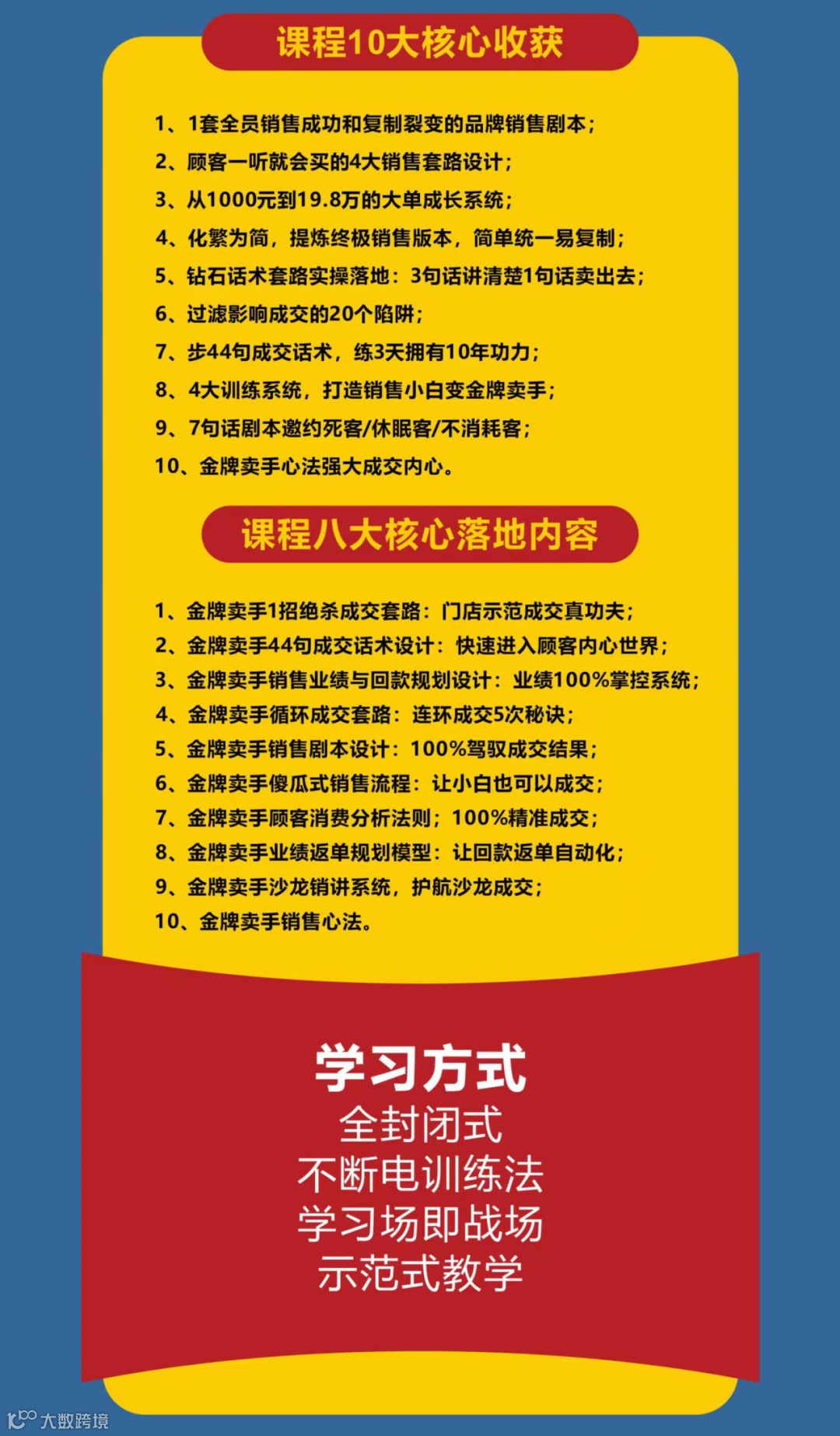“理论+实战+工具”的学习模式,实现金牌卖手教练批量成交核心之:会销课程设计,课程设计三大模块现场落地,让你带着全新的信念与方法离开。