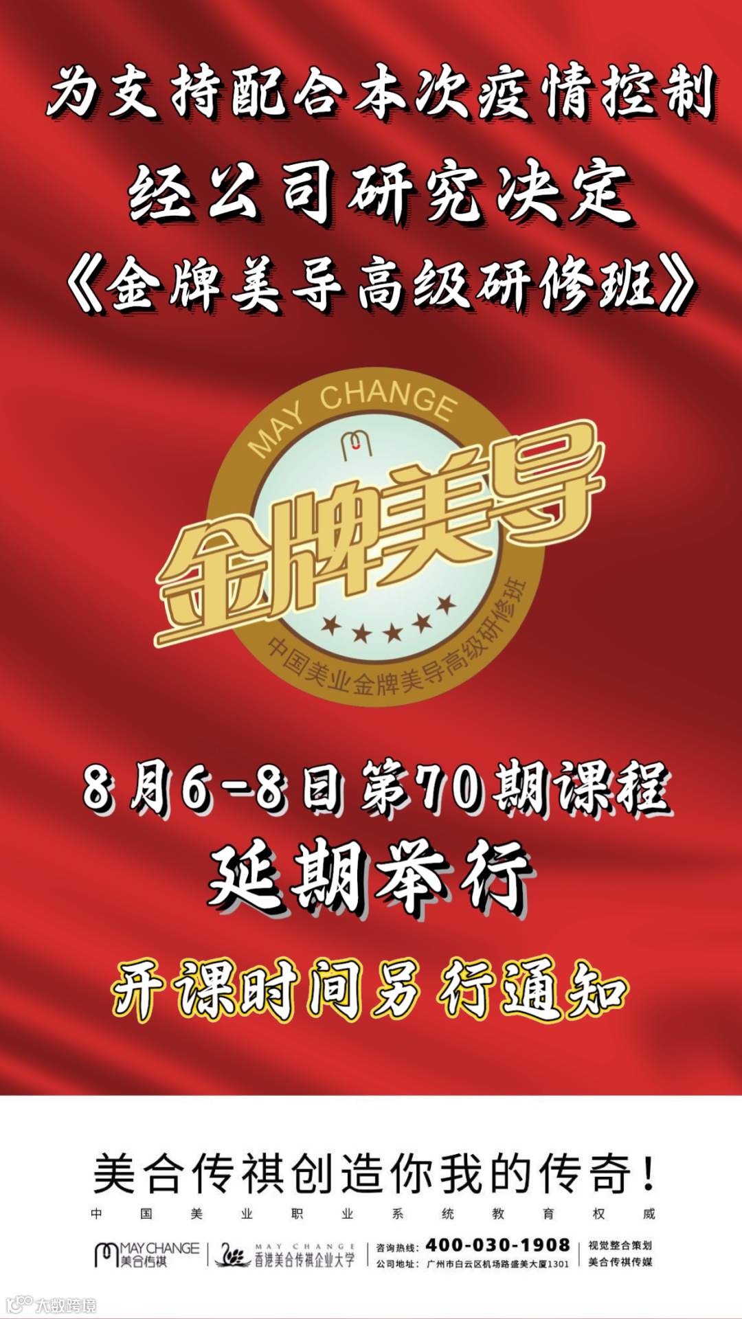因郑州疫情控制,为响应政府管控,经公司研究决定,原定于8月6-8日在郑州举办的中国美业第70期《金牌美导高级研修班》公开课,延期举行,具体日期另行通知!