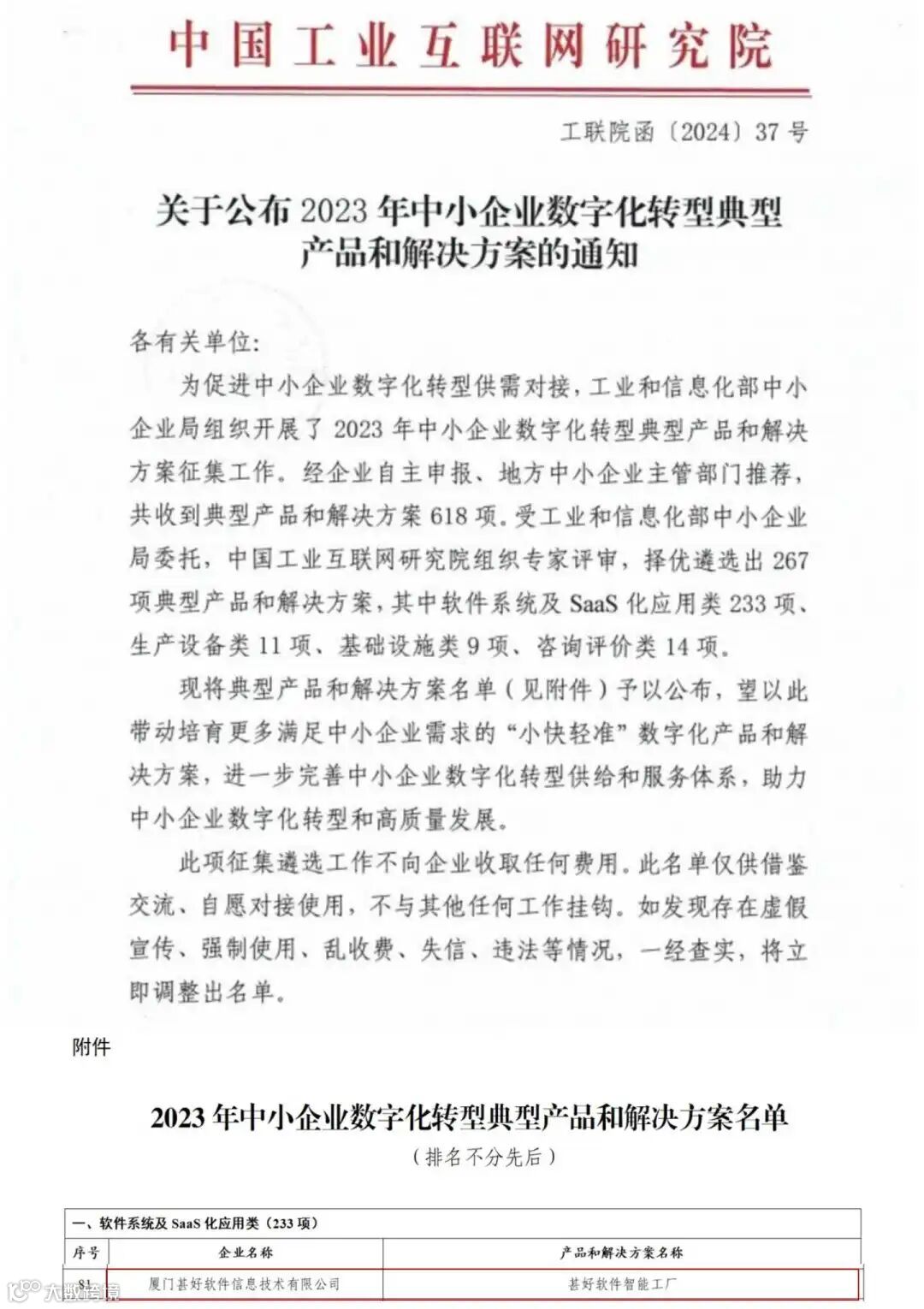 「甚好软件智能工厂」入选工信部2023年中小企业数字化转型典型产品和解决方案。