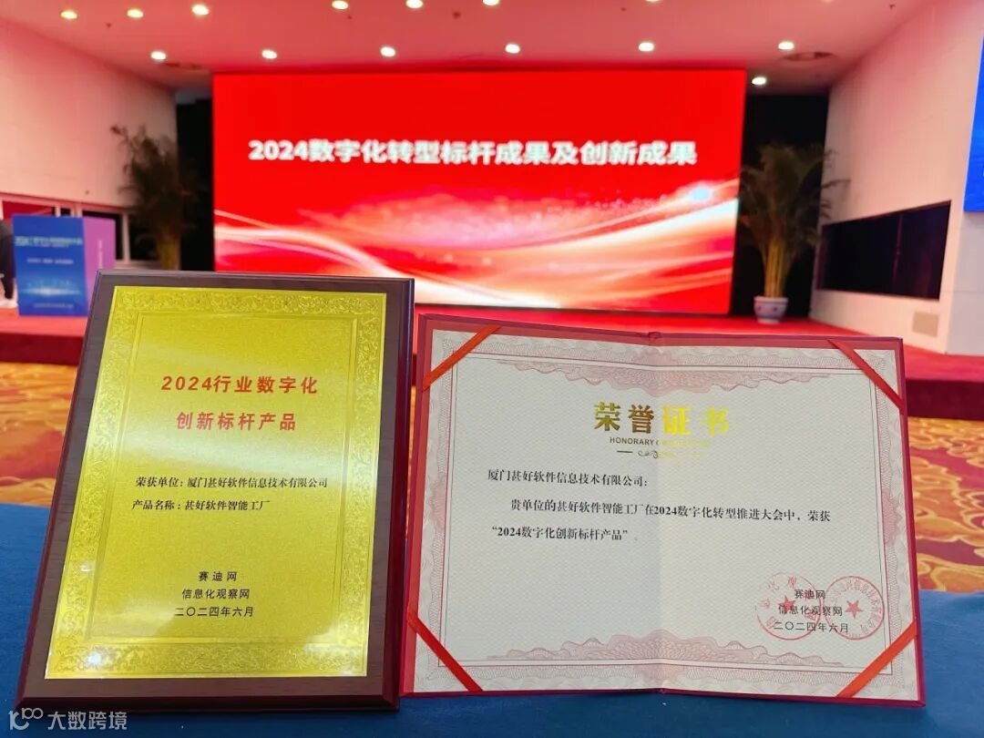 在由赛迪网、信息化观察网主办,软信信息技术研究院承办的“2024数字化转型推进大会”上,「甚好软件智能工厂」凭借“全流程打通、要素全管控、数据全集成、最具性价比”等多重优势,荣获“2024数字化创新标杆产品”奖。