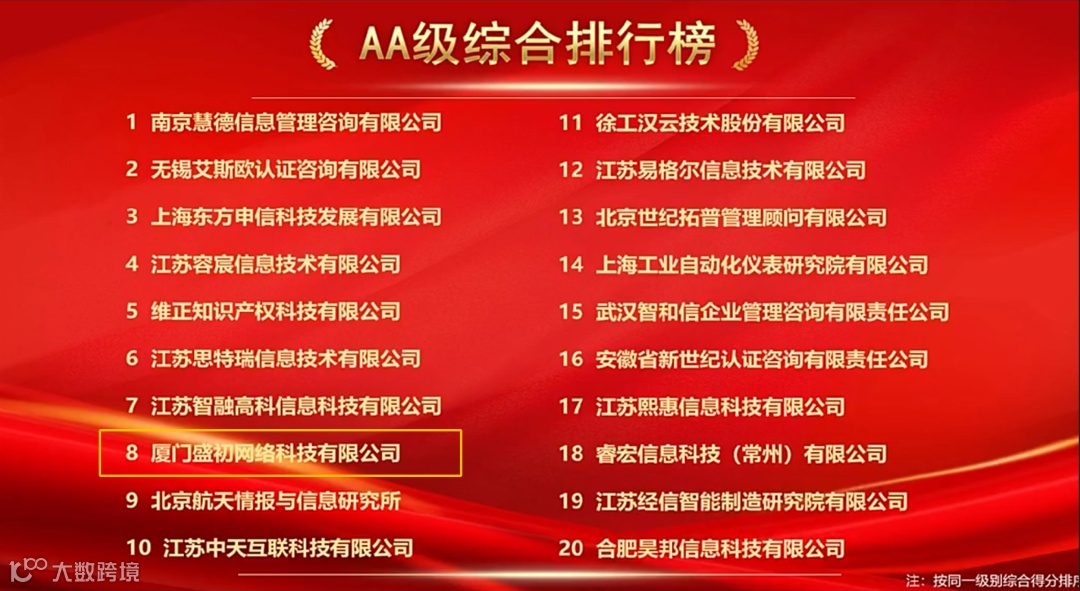 盛初网络获得全国咨询机构综合排行榜(AA级&A级)第8名