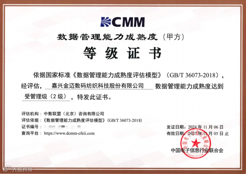 经过专家评审,嘉兴金迈数据管理能力达到受管理级水平,已顺利通过DCMM数据管理能力成熟度二级认证,标志着嘉兴金迈的数据管理体系理论与建设实践通过国家标准检验!