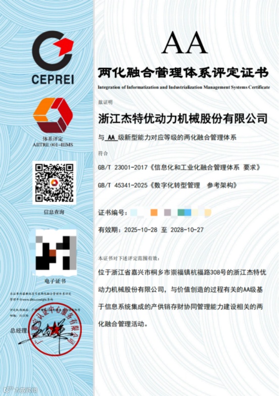 经过专家评审,杰特优动力机械已顺利通过两化融合管理体系贯标升级认证,获得AA级两化融合管理体系评定证书!