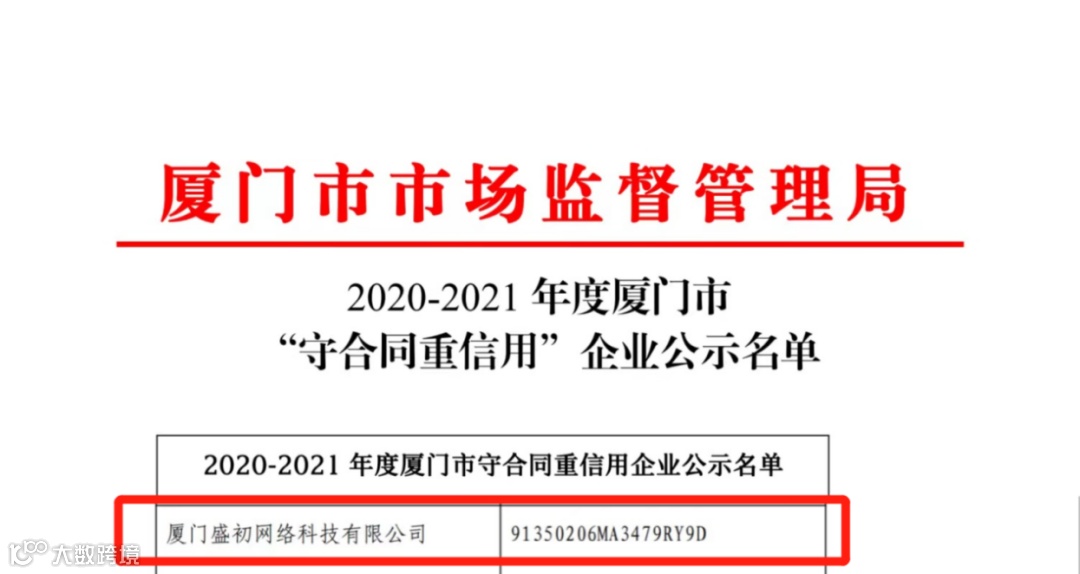 9月22日,厦门市市场监督管理局(知识产权局)对“2020-2021年度厦门市守合同重信用企业”名单进行公示,厦门盛初网络科技有限公司经过评审机构严谨的实际调研、书式审查和企业征信等多项评选程序,凭借在合同管理、合同履约、经营效益等领域的良好表现,成功在众多企业中脱颖而出,获评“2020-2021年度厦门市守合同重信用企业”。