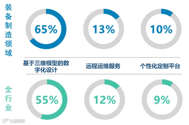 装备制造领域具有研发技术壁垒高、客户定制化需求多、售后运维成本高、上下游产业关联度高以及应用领域广泛等特点。根据平台数据分析结果显示,装备制造业65%的企业开展了基于三维模型的数字化设计,13%的企业提供了产品的远程运维服务,10%的企业建立了产品的个性化定制平台。