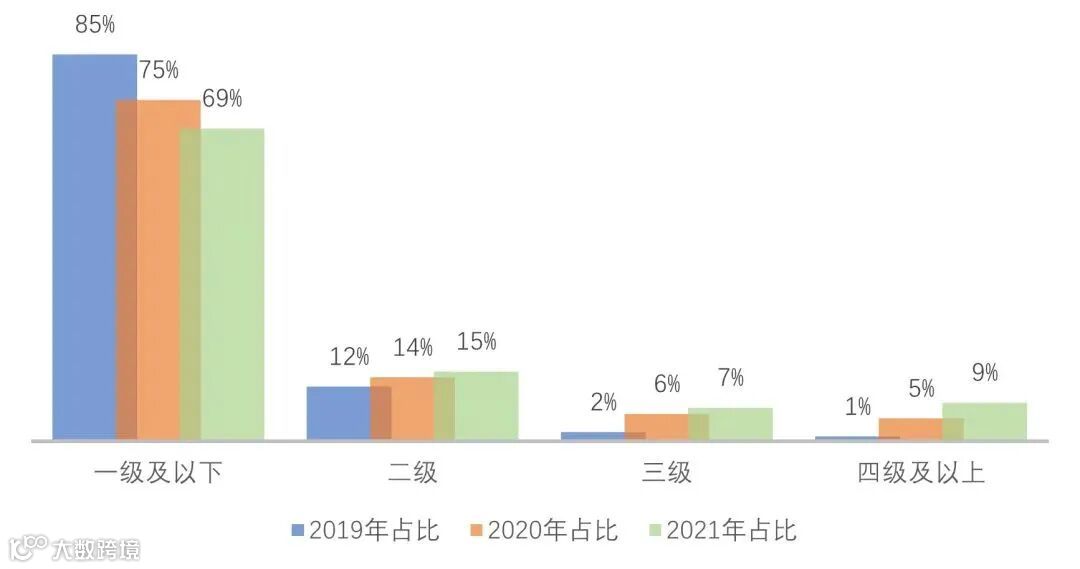 根据服务平台数据显示,目前我国69%的制造企业处于一级及以下水平,达到二级、三级的制造企业分别占比为15%以及7%,四级及以上制造企业占比达9%。2021年全国制造业智能制造能力成熟度较2020年有所提升,一级及以下的低成熟度企业占比减少6个百分点,三级以上的高成熟度企业数量增加了5个百分点。