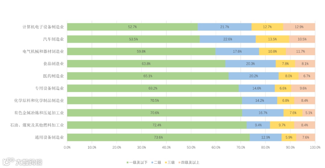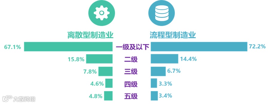 从行业来看,离散型制造业的成熟度水平整体高于流程型制造业。离散型制造企业一级及以下占比约为67.1%,低于流程型制造企业的72.2%,处于二级、三级的离散型制造企业占比较流程型制造企业高出2.5个百分点,处于四级及以上的离散型制造企业数量较流程型制造企业高出2.7个百分点。