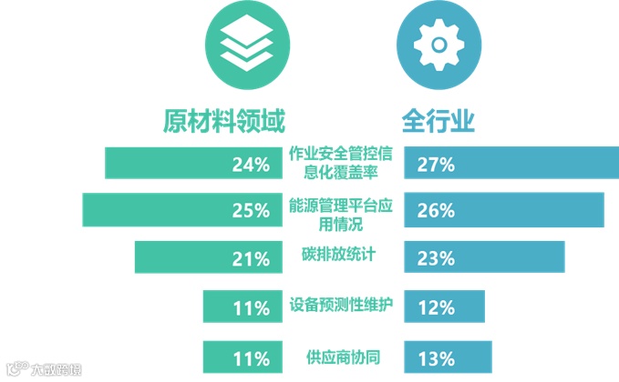 原材料领域具有大型制造装备密集、能源消耗总量大、碳排放与污染物排放强度高、作业安全要求严格等特点。根据平台数据分析结果显示,原材料领域中企业能源管理平台应用率达25%,碳排放统计率达21%,11%的企业针对大型制造设备进行预测性维护,11%的企业实现供应链协同。