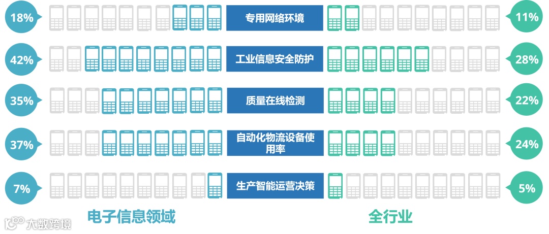 电子信息领域对装备自动化程度要求偏高,对质量过程管控严格,具有信息系统覆盖广泛、生产运营管理高效等特点。根据平台数据分析结果显示,电子信息产业中18%的企业搭建了专用网络环境,42%的企业实现工业信息安全防护,35%的企业在质量检测环节应用了在线检测平台,37%的企业应用了自动化物流设备,7%的企业实现了生产智能运营决策。