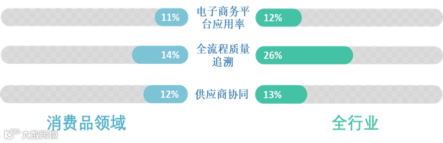 消费品工业对质量控制要求严格、对供应链稳定需求迫切,具备丰富的市场营销渠道。根据平台数据分析结果显示,消费品工业中电子商务平台应用率为11%,全流程质量追溯实现率达14%,12%的企业实现供应链协同。
