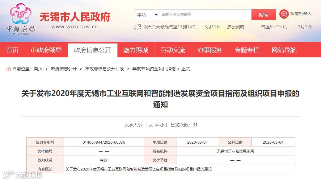 近日,无锡市工信局发布《关于发布2020年度无锡市工业互联网和智能制造发展资金项目指南及组织项目申报的通知》,对把新一代信息技术和智能技术集成应用于企业研发、生产、管理等过程且实现两化深度融合的项目,按照不超过项目软件和技术服务投入额的10%标准给予奖励,最高不超过100万元。