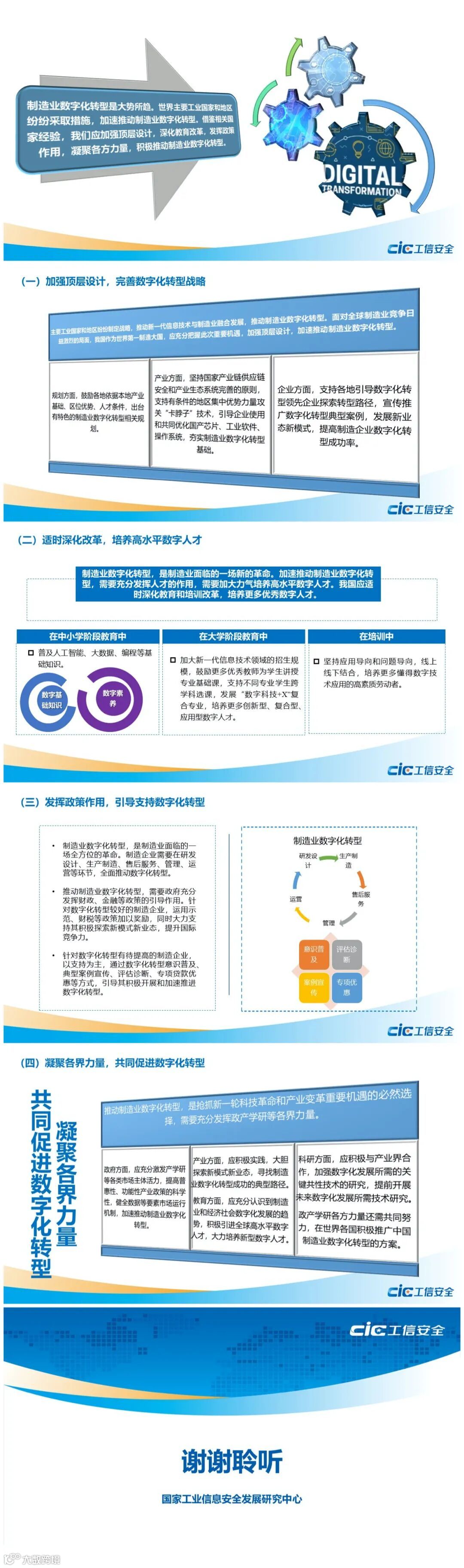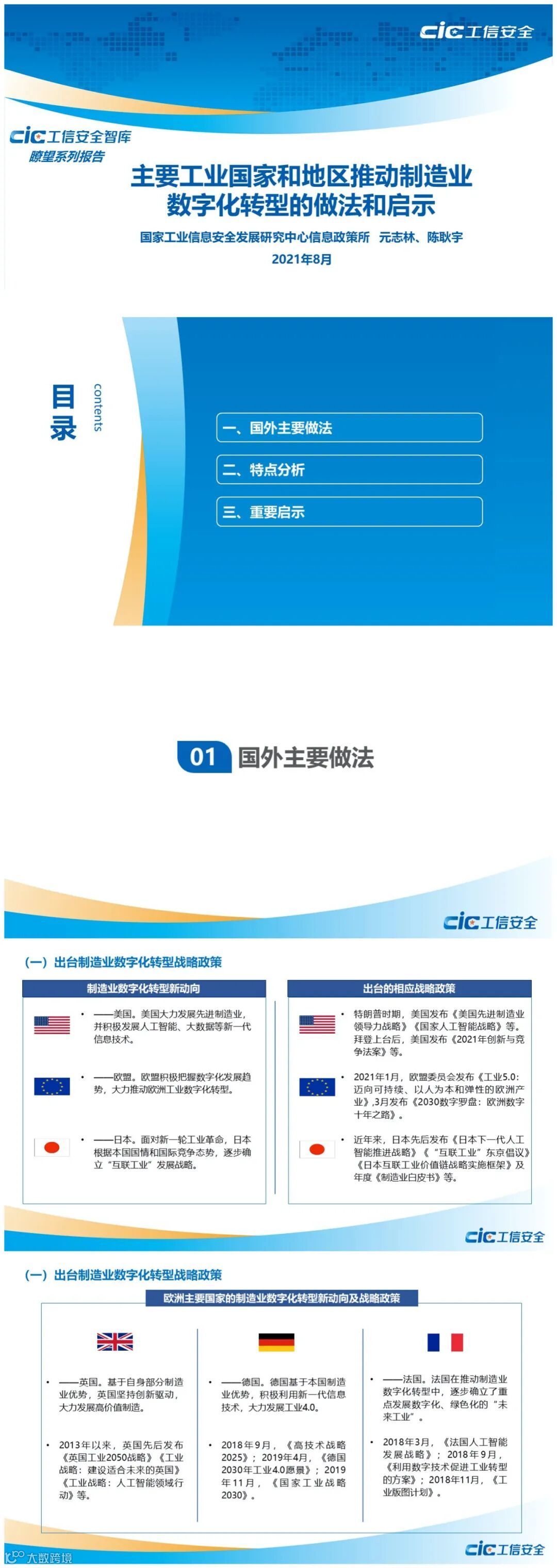 国家工业信息安全发展研究中心信息政策所数字经济研究室助理工程师元志林在第十六场“工信安全智库”系列报告在线发布活动上发布了《主要工业国家和地区推动制造业数字化转型的做法和启示》瞭望报告。报告全球主要工业国家和地区在数字化转型方面的主要做法和特点,提出了对我国数字化转型的启示和建议。