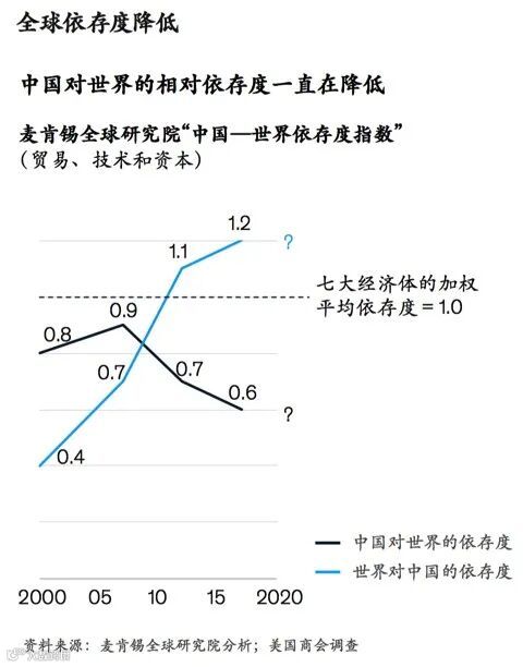 与此同时,世界对中国的依存度却在过去10年稳步上升。