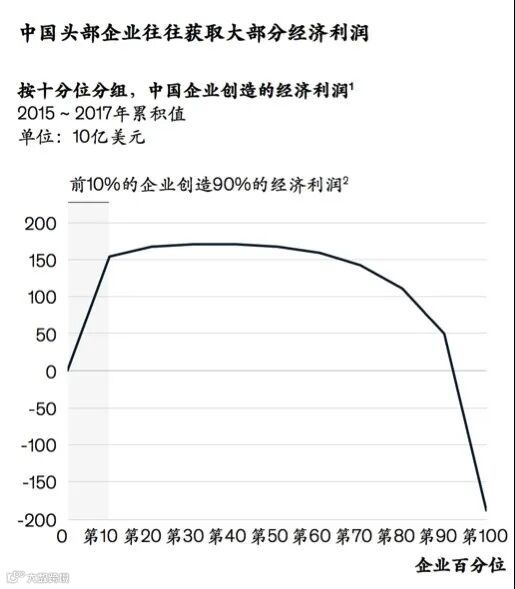 这还不是最可怕的,更可怕的是头部以下,腰部缺失,大量尾部企业生存困难。麦肯锡的报告显示,从第40个百分位开始,中国企业创造的经济利润价值开始下降。这意味着,除了前30%的企业能实现盈利,有高达70%的企业表现不佳甚至大幅亏损。