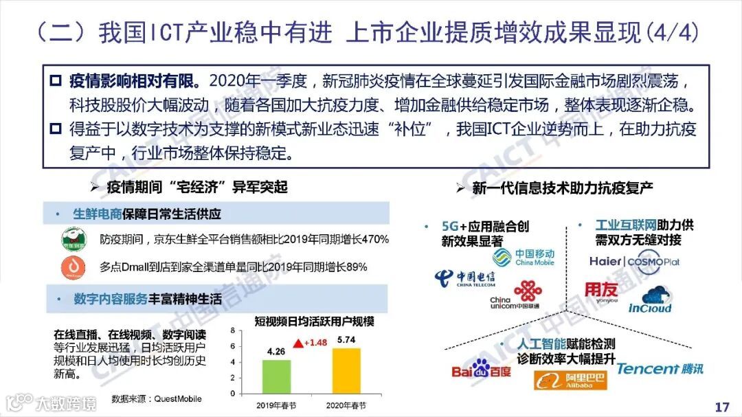 2020年5月21日,中国信息通信研究院(以下简称“中国信通院”)与数字中国产业发展联盟联合举办了“数字中国产业发展在线论坛”。论坛上,中国信通院发布了《2020数字中国产业发展报告(信息通信篇)》。