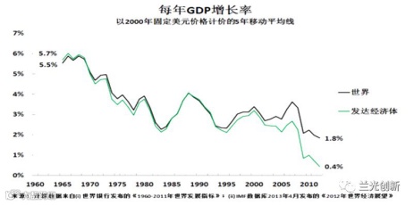 现在全球经济都面临下行压力,不只是中国。如下图所示,这些年来发达国家平均下降到了0.4%,发展中国家降到了1.8%,有些国家甚至是负的增长。零是什么?零是绝望,零就意味着新开一家饭馆就要关一家饭馆。