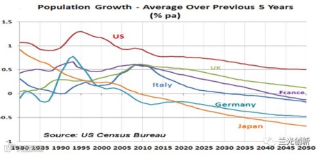 ▲ 图3 主要工业国家人口增长率 来源:美国Census Bureau