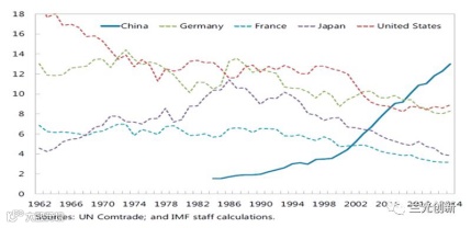 ▲ 图4 主要工业国家出口在全球中的比重 来源:联合国和国际货币基金组织