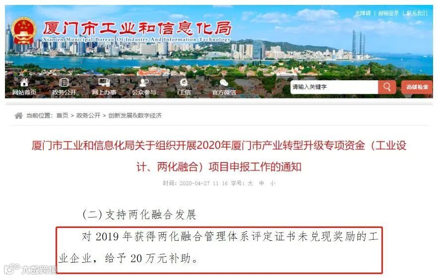 近日,厦门市工信局发布《关于组织开展2020年厦门市产业转型升级专项资金(工业设计、两化融合)项目申报工作的通知》,对2019年获得两化融合管理体系评定证书未兑现奖励的工业企业,给予20万元补助。网络申报截止时间为2020年5月10日。