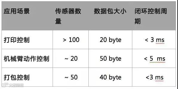 闭环控制系统不同应用中传感器数量、控制周期的时延要求、带宽要求都有差异,典型来看,周期时间和通信带宽大小的一些典型值如下: