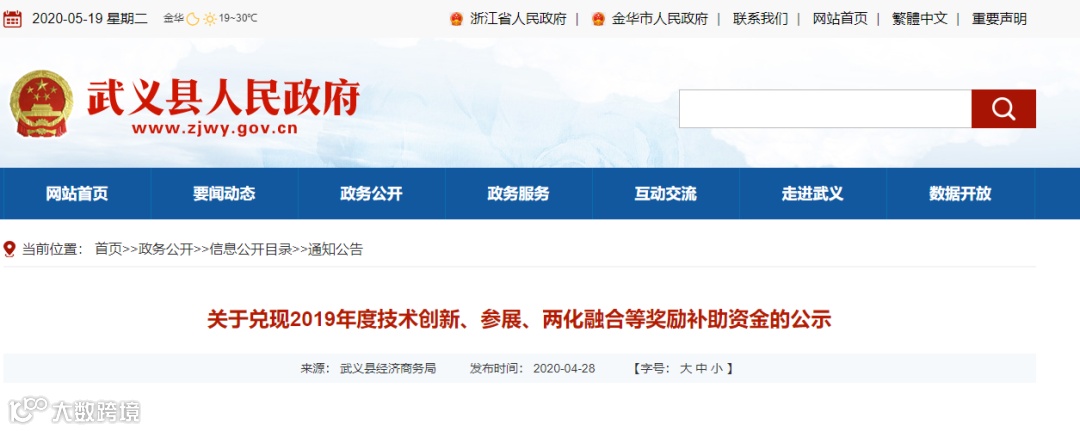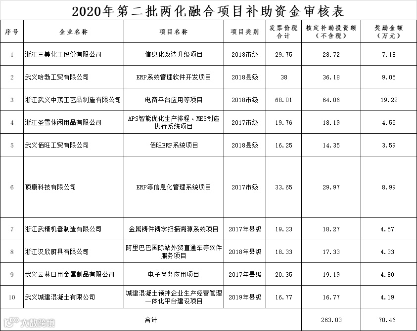 近日,武义县经济商务局、武义县财政局联合发布《关于兑现2019年度技术创新、参展、两化融合等奖励补助资金的公示》,其中6家企业获得2020年第二批两化融合项目补助资金,最高为19万元。