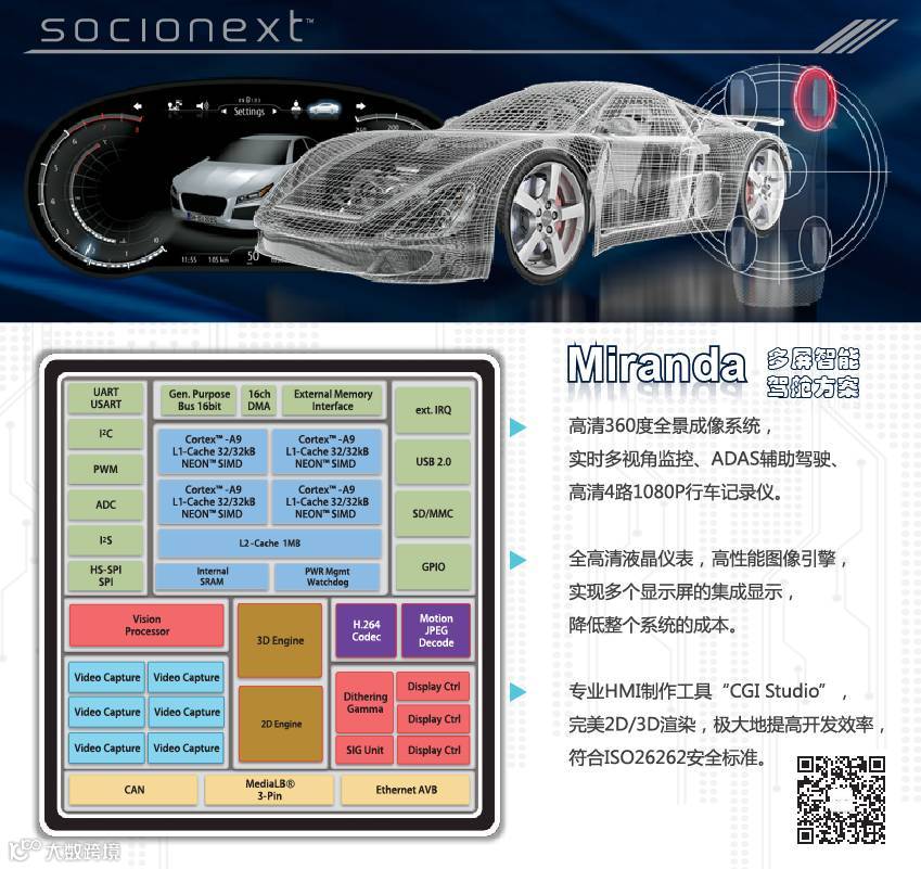 Miranda产品采用ARM构架,Cotex-A9 Quad core 1GHz CPU资源;搭配强大的GPU处理器,极大的增强了对图像的渲染处理能力,可以使显示画面清晰锐利;VPU处理单元更好的匹配ADAS应用。Miranda强大的处理能力,可以同时实现全高清液晶仪表、超高清全景环视及行车记录仪等功能,其性能出众且功耗较低,适合车载SoC的使用场景;