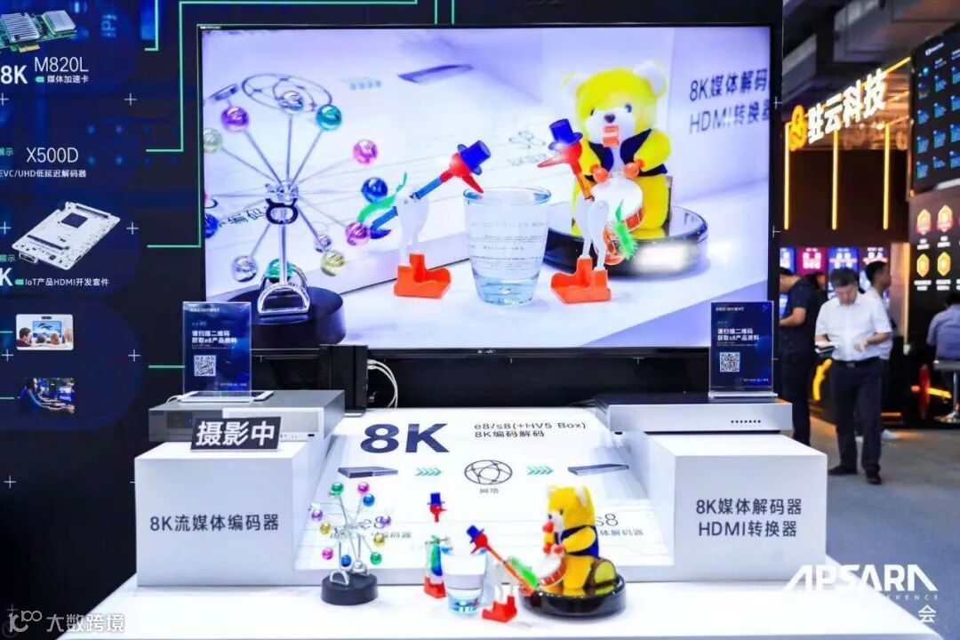 8K直播呈现的不仅仅是高清晰度的提升,更多的是对细节的呈现,对低延迟的要求。现场通过8K超高清摄像机拍摄桌面玩偶,经现场网络传输及Socionext最新发售的8K编码器“e8”实时快速编码和8K媒体播放器“s8”解码,将画面传输至现场8K大屏。