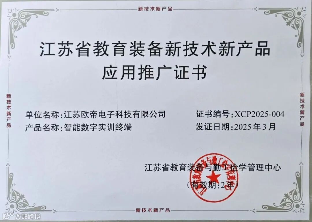 近日,欧帝科技旗下智能数字实训终端(OdinDTX)成功获得江苏省教育装备与勤工俭学管理中心颁发的"江苏省教育装备新技术新产品应用推广证书",标志着该产品在教育数字化领域的创新价值和应用潜力获得了权威认可。