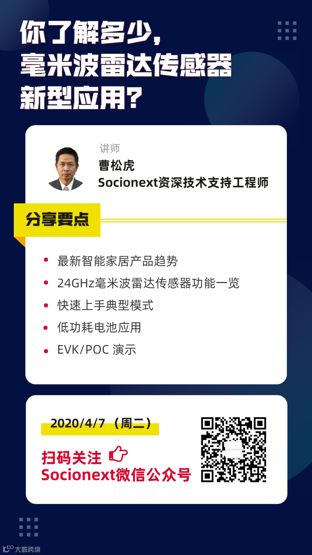 为满足市场需求,Socionext 推出多款CMOS毫米波雷达传感器,可为各类智能家居和IoT设备提供如人体位置和移动检测等高灵敏度、低功耗的传感技术,并于下周二推出一期以“智能家居中的低功耗毫米波雷达传感器技术”为题的在线分享小课程。