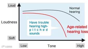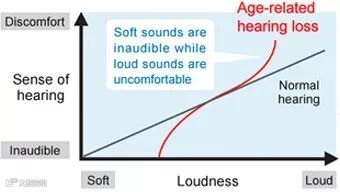事实上人口老龄化问题不仅仅出现在日本,美国、韩国、英国甚至是全球各国共同面临的问题。目前我国人口老龄化问题也十分突出,其老年性耳聋的发病率亦呈上升趋。老年性耳聋收听声音时,就会出现高音听着费劲(图1),小声音听不见,而大的声音又感觉心烦(图2)等症状。