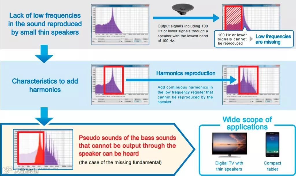 利用人的听觉特性(耳朵的错觉)扩张低音域,并通过补充完善丢失的低音域连续谐音,以仿真方式再现低音,让即使是频率范围小、成本低的小型薄型扩音器,也能播放出富有现场感的低音。