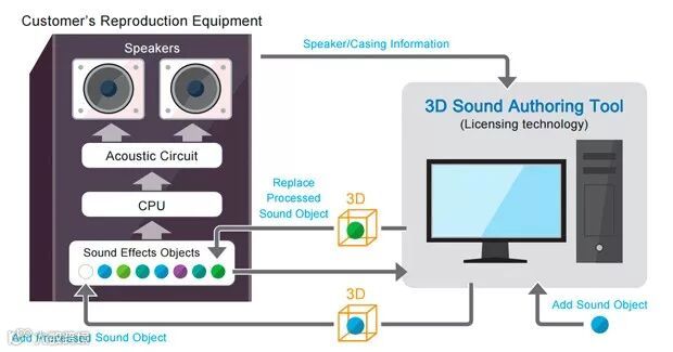 Socionext 3D音响技术决充分利用了空间声学技术,提供逼真的沉浸式体验,增强存在感并增加最终产品的价值。最终产品只需要将声音对象处理成3D声音对象,创作工具将声音对象离线处理,开发出3D环绕声的效果。