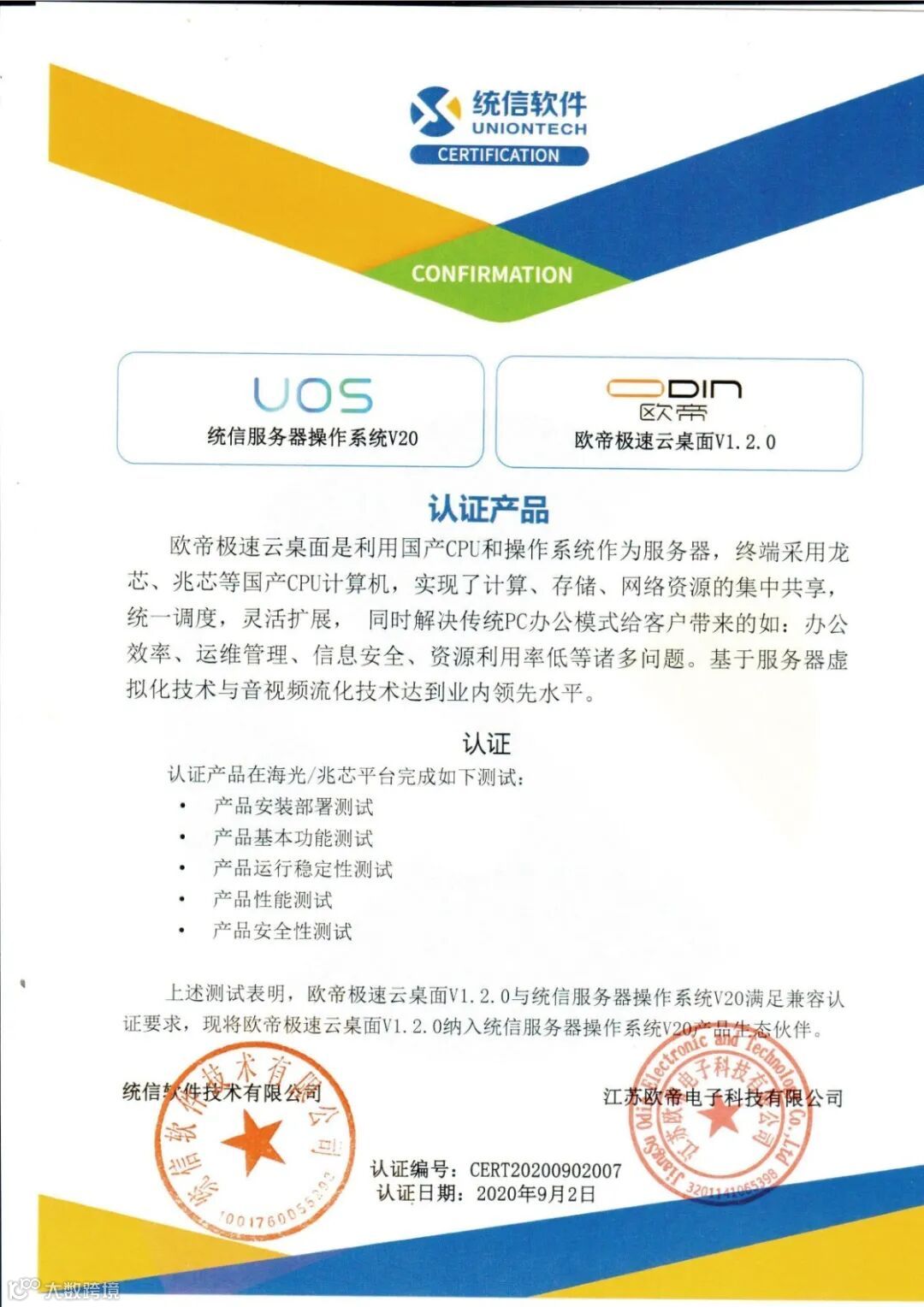 近日,欧帝极速云桌面V1.2.0与统信服务器操作系统V20完成适配互认证。本次兼容互认证基于国产化服务器与终端芯片,基于海光、兆芯、龙芯等平台完成,覆盖了产品安装部署测试、产品基本功能测试、产品运行稳定性测试、产品性能测试、产品安全性测试。