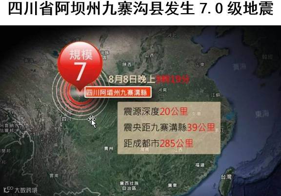 2017年08月08日21时19分,四川省阿坝州九寨沟县发生7.0级地震,震中位于北纬33.20度,东经103.82度,震源深度20千米。面对灾难,愿逝者安息,生者坚强。