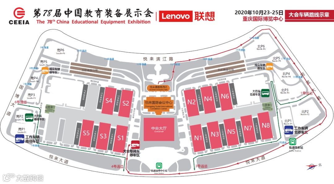 ①乘坐轨道交通10号线,重庆北站北广场站上车(王家庄方向)→悦来站下车(站内换乘)→乘坐轻轨6号线(开往礼嘉方向)→国博中心站下车(3号出口),全程约50分钟。