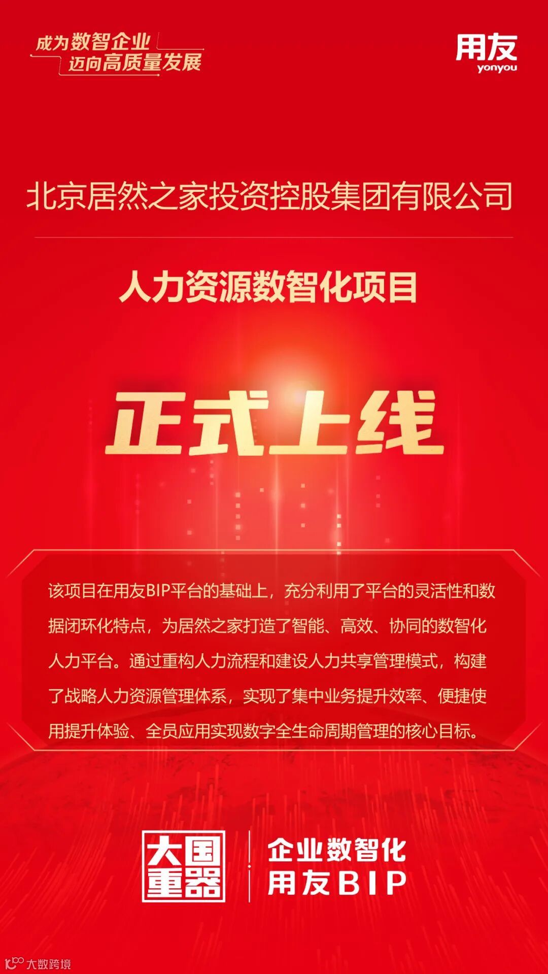 近日,由用友承建的北京居然之家投资控股集团有限公司(简称:居然之家)人力资源数智化项目首阶段目标成功上线!