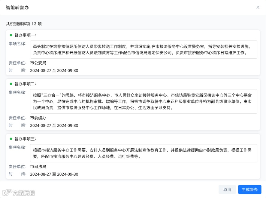 基于NLP技术自动解析文件,生成任务清单并匹配责任单位,支持一键分派至承办人员。
