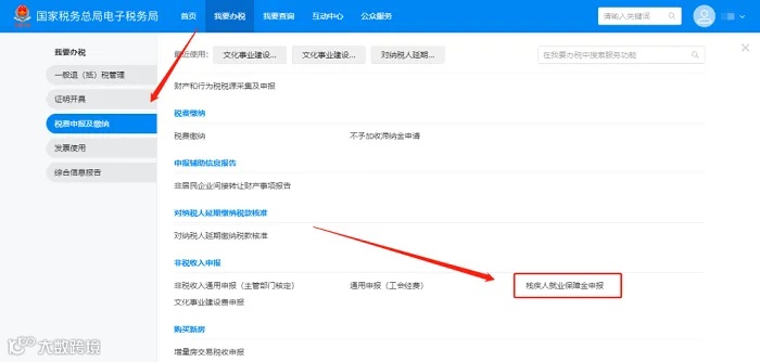 一、登录新电子税局后,点击【我要办税】 -【税费申报及缴纳】- 【非税收入申报】-【残疾人就业保障金申报】功能菜单进入申报页面。