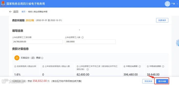 (2)纳税人可对上年在职职工工资总额、上年在职职工人数、等数据进行依次填写和修改,确认无误后点击“提交申报”,进入申报提交页面,申报成功后跳转申报结果反馈页面。