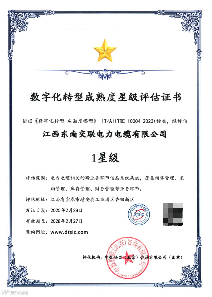 为客观评估自身数字化转型的深度、广度和水平,明确转型方向和目标,提升数字化转型的效率和效果,东南交联于2024年携手厦门盛初网络科技有限公司(下称“盛初网络”)开展数字化转型成熟度星级评估贯标工作。