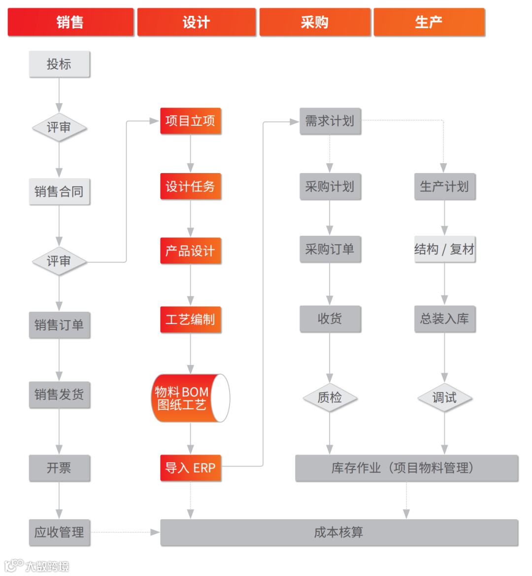 由于是项目型制造、订单式生产,实施PLM帮助企业做到流程标准化,使企业质量管理体系能够在软件系统中固化和执行,使在一个产品全生命周期中参与设计、制造产品的人员都可以在正确的时间、以正确的方式得到正确的任务,从而保证企业内部工作有计划地进行。