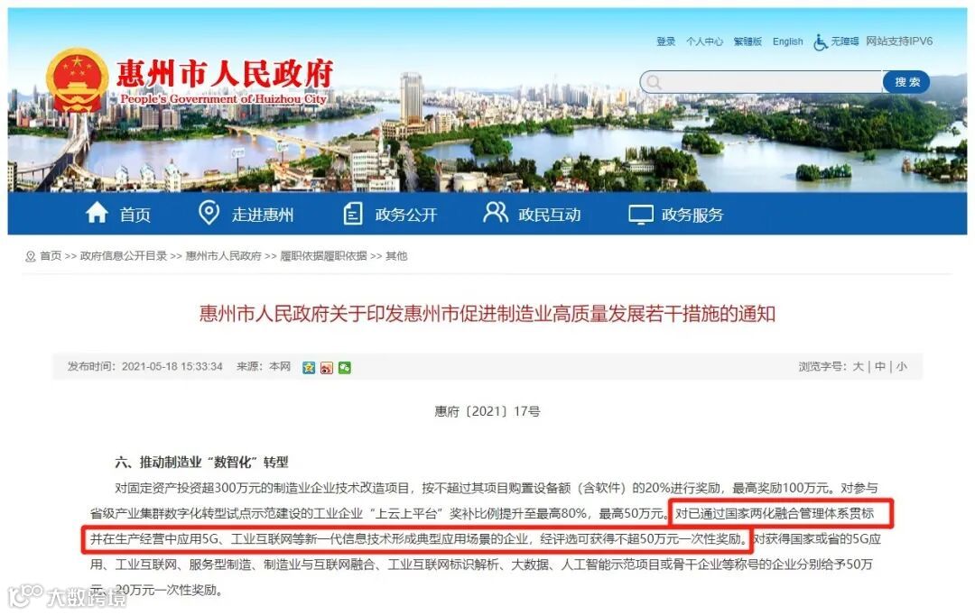惠州市人民政府5月18日发布《关于印发惠州市促进制造业高质量发展若干措施的通知》,出台十条措施,其中提出,推动制造业“数智化”转型——对固定资产投资超300万元的制造业企业技术改造项目,按不超过其项目购置设备额(含软件)的20%进行奖励,最高奖励100万元。