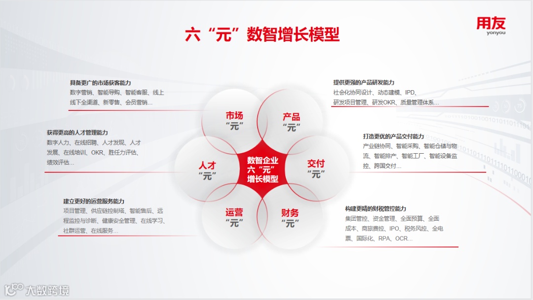 通过六“元”数智增长模型,用友更清晰的展现了成长型企业的增长点和创新点,客户也更清楚自己需要构建什么样的综合能力,短板在哪里。在这一模型下,用友与客户的沟通也变得简单,缺哪块就针对性地补哪块。