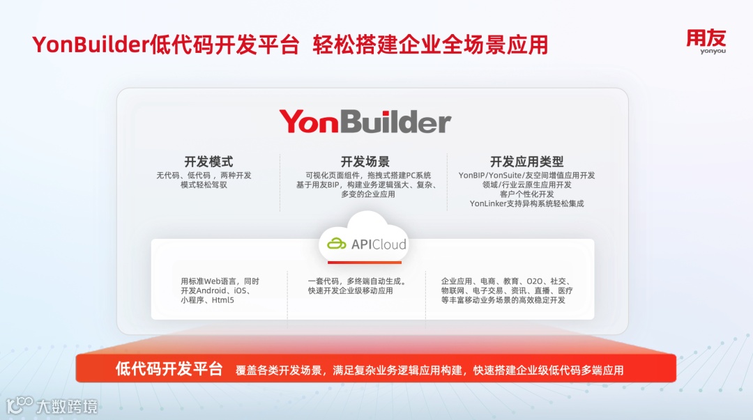 用友YonBuilder低代码开发平台是用友BIP面向客户及全生态的开发平台,依托用友多年技术沉淀,以云原生、多租户、模型驱动为基础技术,面向包括原厂开发、ISV开发、本地化开发、企业自建、个人开发者在内的全生态,提供无代码和低代码的可视化开发能力。其中APICloud可为企业提供移动端业务快速落地的技术解决方案,同时将需求梳理、UE/UI设计、前端开发、后端开发等环节紧密衔接,通过低代码工具链实现全流程敏捷开发。