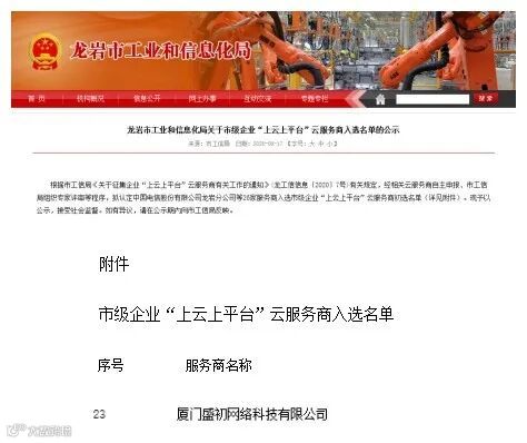 8月22日讯,经过龙岩市工信局组织专家评审与层层严格审核程序,厦门盛初网络科技有限公司(以下简称“盛初网络”)作为两化融合管理体系、智能制造、信息化管理等领域的综合解决方案提供商位列其中,成为2020年龙岩市市级企业“上云上平台”云服务商。