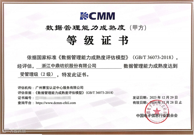 经过专家评审,中鼎纺织已顺利通过DCMM数据管理能力成熟度二级认证,标志着中鼎纺织的数据管理体系理论与建设实践通过国家标准检验!