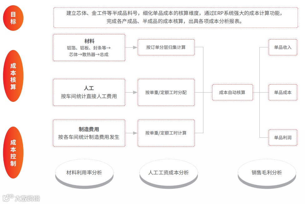 通过 ERP 的成本核算系统对接各业务环节数据,实现成本环节的精细高效核算,通过成本模块自动取数和计算,分级核算每个零部 件产品规格的完工成本,分项显示料、工、费构成;自动计算每单成本毛利进行分析,对成本差异较大物料进行还原和量化。
