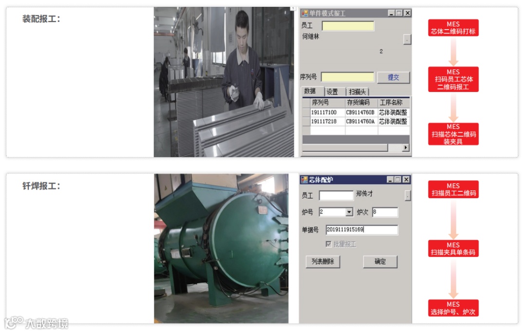 • 车间根据流转卡进行工序扫码报工,采集人员、机台、产量、质量、设备参数信息,成品完成后,扫描条码入库,实现单台管理,实时盘库。