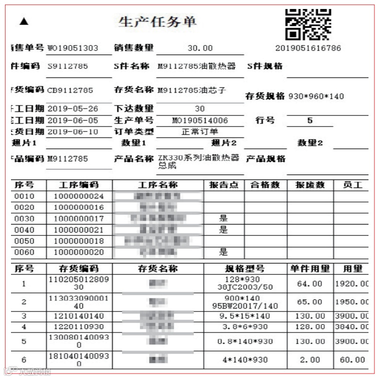 • 生产部根据生产订单在车间 MES 系统开单件或批量流转卡,打印后进行扫码领料。